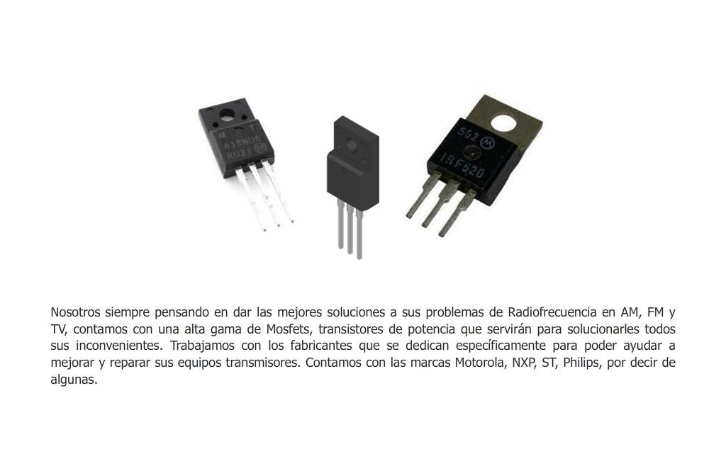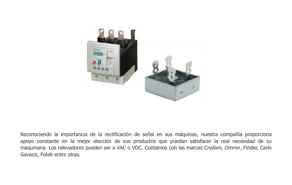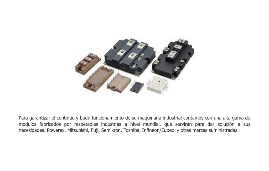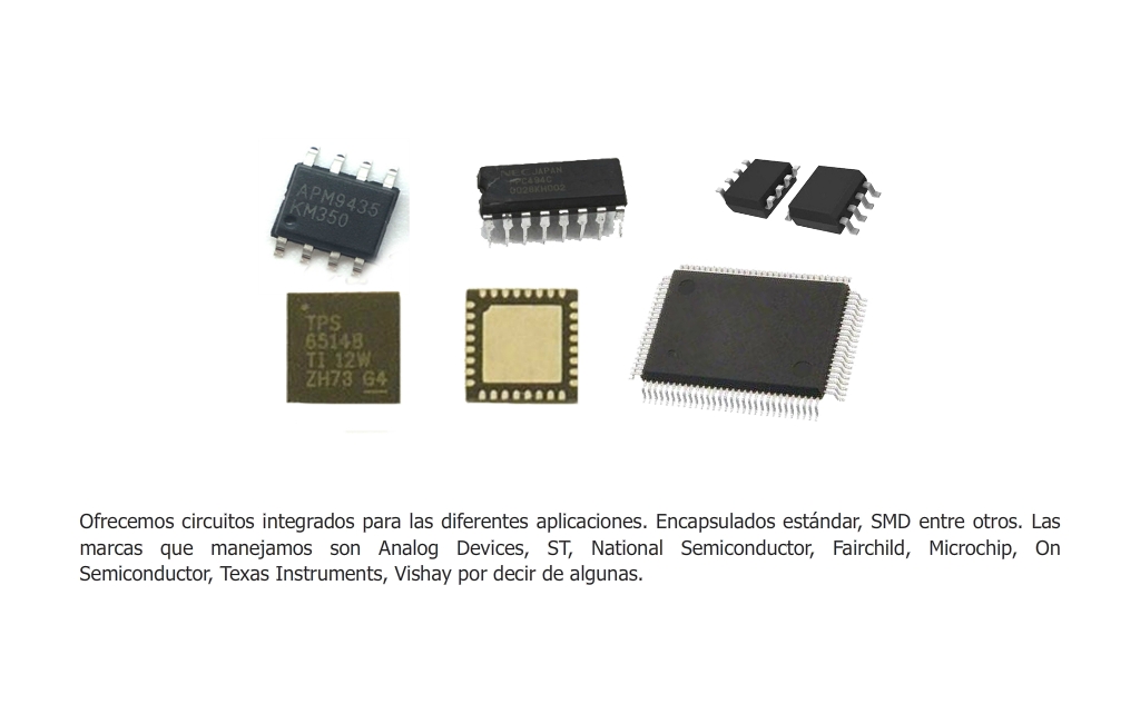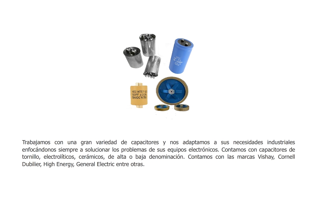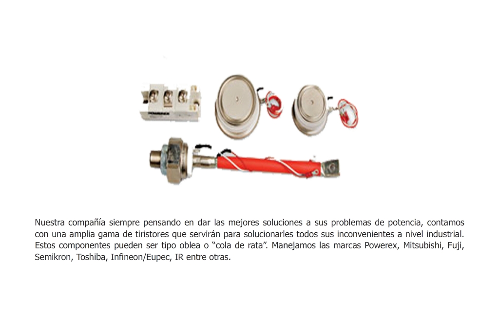 Se suministra una amplia gama de componentes electrónicos para el sector industrial como tiristores, diodos, Mosfets, transistores, circuitos integrados, módulos de potencia, capacitores, resistores, potenciómetros/reóstatos y relevadores. Trabajamos con marcas reconocidas en el campo industrial, comunicaciones, radiofrecuencia, entre otros.